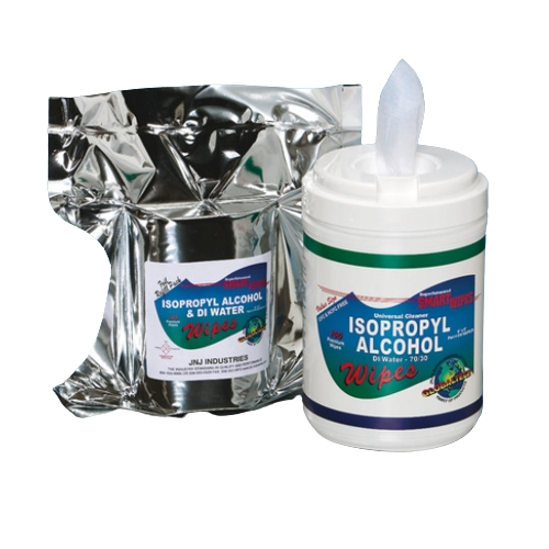 GlobalTech® 70/30% Isopropyl Alcohol & DI Water Presaturated Wipes, Hydroknit® (10052IPA/DI) Comprised of Hydroknit®, a patented cellulose and polypropylene nonwoven fabric. These industrial grade presaturated wipes offer the perfect balance of strength and absorptivity making them suitable for a wide range of industrial applications. These wipes won't scratch soft surfaces; yet have sufficiently active texture to clean surfaces. Removes most types of inks, pastes, fluxes, light oils and other contaminants associated with assembly, machining, soldering and printing. Ideal for use in surface preparation prior to manufacturing or assembly processes. Other IPA/DI wipe material options: polyester and critical-clean.