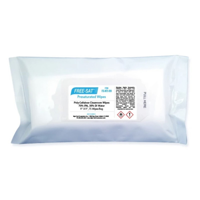 FREE-SAT® FS-NT1-99 are 9in x 9in wipes presaturated with 70% IPA and 30% DI Water. They contain four clean-cut edges made from hydro-entangled nonwoven material composed of 45% polyester and 55% cellulose. They are saturated with 70% IPA, which is the ideal amount for a variety of cleanroom wiping applications.