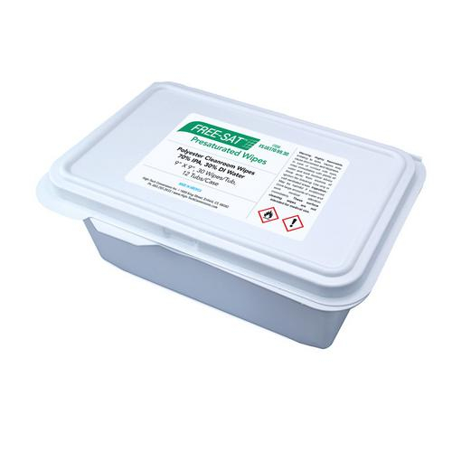 9″x9″ cleanroom wipes are presaturated with 70% isopropyl alcohol / 30% DI water. Comprised of a synergistic blend of virgin polyester and cellulose, FREE-SAT™ presaturated wipes are tough, abrasion resistant, absorbent, and virtually free of particle generation. They contain four clean-cut edges designed to eliminate fiber contamination, making them ideal for a variety of laboratories and controlled environments.
