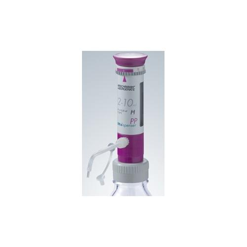 Bottle attachment dispenser for non-problematic watery and organic media which do not attack polypropylene, with variable volume configuration in appropriate steps, certified conformity, with precision ground glass piston, suitable for steam sterilisation up to 121°C, A 32 screw thread, delivery complete with 3 threaded adapters (A 28, S 40, A 45), 1 suction hose with union nut, 1 ejection unit and 1 fitting wrench, with individual serial number and calibration certificate.