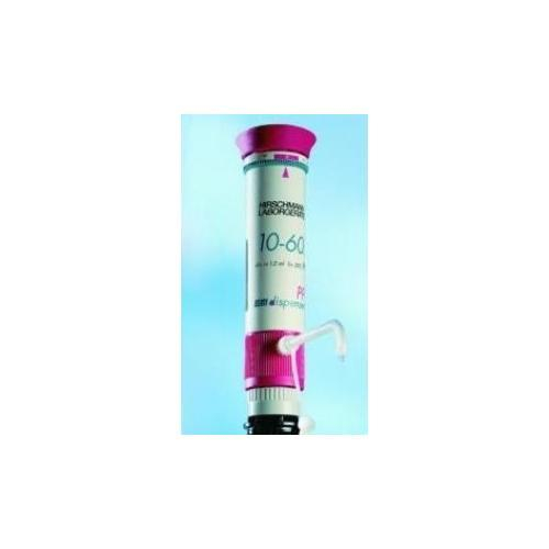 Bottle attachment dispenser for non-problematic watery and organic media which do not attack polypropylene, with variable volume configuration in appropriate steps, certified conformity, with precision ground glass piston, suitable for steam sterilisation up to 121°C, A 32 screw thread, delivery complete with 3 threaded adapters (A 28, S 40, A 45), 1 suction hose with union nut, 1 ejection unit and 1 fitting wrench, with individual serial number and calibration certificate.