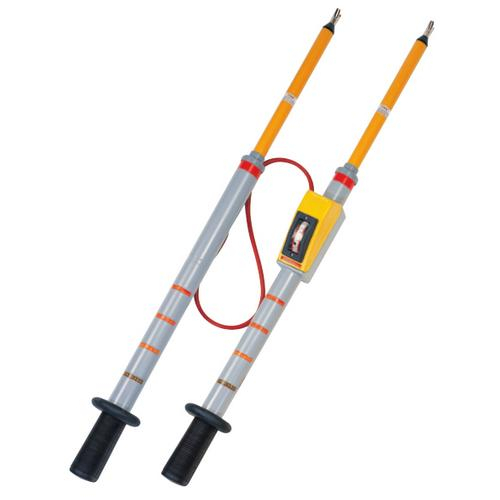 Fiberglass is of hot stick quality and tested to IEC specs (100kV / 300mm for 1 min). All front end (resistors) are encapsulated. These analogue Multifunction Phasing Sticks are ideally suited for testing of grounded or ungrounded systems. Important applications include checking voltage fuses, testing for correct phase connections, and for absence of high voltage on de-energized lines or apparatus. The dual scale read direct (no multiplier) in kVac or in % of full scale and is color coded (Green = in phase, Red = out of phase). A bright neon is included on the scale for easy visibility indoor and it has dual purpose. The neon is also a detector and start to lit when the voltage across the poles is higher than 1200Vac. In case of unlikely failure of the analogue scale indicator, the neon can be used as voltage detector.