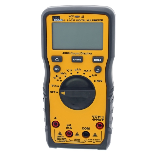 The IDEAL 61-337 Digital Multi Meter is a CAT III 600 rated auto ranging digital multi meter that measures up to 10 Amps AC and DC current via the test leads in series with the load. It measures up to 600V AC and DC, AC V, frequency, resistance, continuity, capacitance, and diodes via test-leads (included) and measures temperature (F/C) via a K-Type thermocouple (included). It's capable of detecting the presence of voltage between 40V to 600V via a non-contact sensor in the top center of the meter. It's display can be backlit. The unit uses an illuminated red LED in the center of the meter and emits audible tones to notify when voltage is above 30 volts, when continuity is detected and when the NCV senses voltage within its set range. The rubber boot has two probe storage points, has built-in probe tip holders to allow measurements while holding the meter in one hand and the second lead in the other hand. The meter has a hanging strap mount (compatible with all other IDEAL meters with this feature) that allows for a hanging strap (sold separately) to be attached to the meter so it can be hung from a nail, screw or magnetic surface. A rugged over molding enhances grip and drop protection. This meter features HOLD, Relative, Range, and selectable Auto Power Off functions. The meter comes with 3 1.5V AAA Batteries and an easy open, fully accessible storage pouch with a belt loop that allows for meter, probes and thermocouple storage.