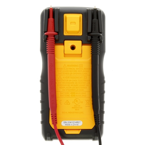 The IDEAL 61-337 Digital Multi Meter is a CAT III 600 rated auto ranging digital multi meter that measures up to 10 Amps AC and DC current via the test leads in series with the load. It measures up to 600V AC and DC, AC V, frequency, resistance, continuity, capacitance, and diodes via test-leads (included) and measures temperature (F/C) via a K-Type thermocouple (included). It's capable of detecting the presence of voltage between 40V to 600V via a non-contact sensor in the top center of the meter. It's display can be backlit. The unit uses an illuminated red LED in the center of the meter and emits audible tones to notify when voltage is above 30 volts, when continuity is detected and when the NCV senses voltage within its set range. The rubber boot has two probe storage points, has built-in probe tip holders to allow measurements while holding the meter in one hand and the second lead in the other hand. The meter has a hanging strap mount (compatible with all other IDEAL meters with this feature) that allows for a hanging strap (sold separately) to be attached to the meter so it can be hung from a nail, screw or magnetic surface. A rugged over molding enhances grip and drop protection. This meter features HOLD, Relative, Range, and selectable Auto Power Off functions. The meter comes with 3 1.5V AAA Batteries and an easy open, fully accessible storage pouch with a belt loop that allows for meter, probes and thermocouple storage.