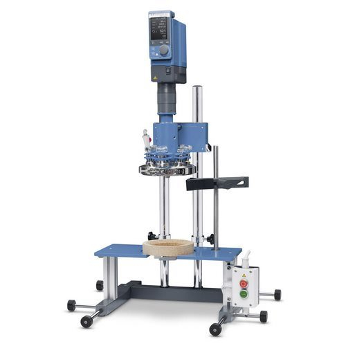 Modularly configured laboratory reactor for the optimization and reproduction of various chemical reactions, mixing and homogenization processes on a lab scale. The system is particularly characterized by the agitator mounting, which allows for a safe transfer of the higher motor torque. ULTRA-TURRAX dispersers, temperature sensors, flow breakers and other accessories can be attached to the open ports of the reactor cover.