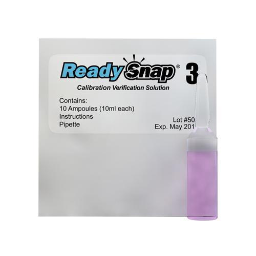 The purpose of the ReadySnap® 3 Calibration Verification Solution is to verify the working condition of your eXact® photometer (525 nm ) and ensure correct testing procedure is followed. The ReadySnap® 3 Calibration Verification Solution is ideal for regulators and inspectors who require a strict verification method. Each ampoule contains a colored liquid which simulates a predetermined analyte value. If your photometer is tested using this ReadySnap® 3 Calibration Verification Solution and the generated results are within the acceptable range, as specified in your eXact® photometer manual, then calibration is verified.