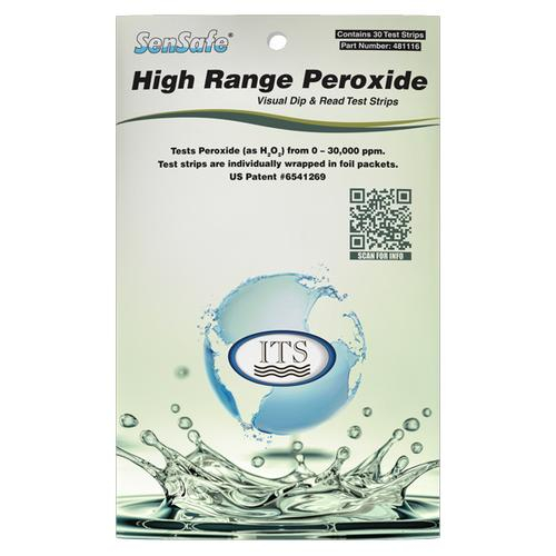 SenSafe® High Range Peroxide water quality testing strip tests for high range concentrations of H2O2 in water with a single dip test method. Accurate results from 0 to 30,000 ppm (mg/L) are obtained in under one minute, making the new peroxide test strip ideal for a wide range of industries. Note: A mechanical reader is NOT required and the unique indicator is reactive only to peroxide.