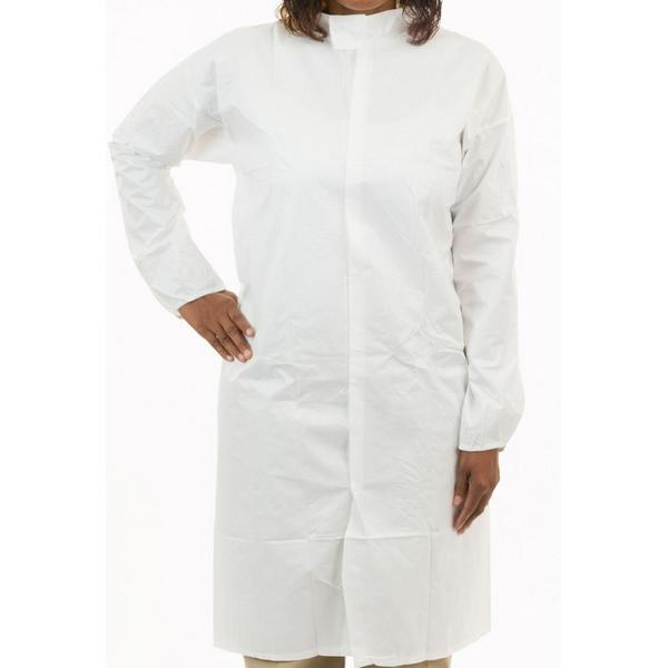 Sterile frocks made of a comfortable fabric with a superior liquid and particulate barrier. Each is sterilized to a 10-6 sterility assurance level (SAL). Low-linting fabric helps reduce the release of unwanted particulates. Tunnelized elastic provides a more secure closure, stronger seams and eliminate raw edges that may generate particulate. Each frock is individually packaged.