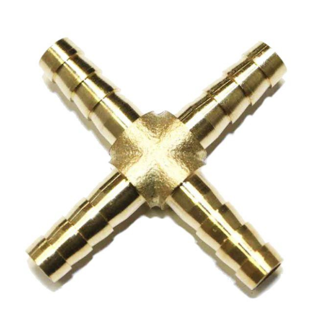 Brass Hose Barb Cross Manifold Fitting is machined barb from a solid brass stock using CNC machine center. This brass manifold fitting has thicker walls and long length, this product can be used with PVC, PU, Rubber hose or tubing and to be secured with a hose clamp or crimped ferrule.