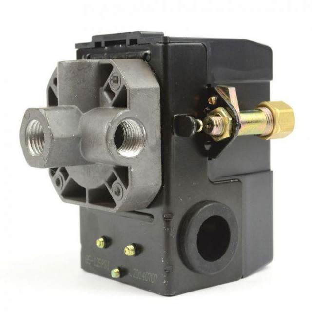 4 port 85-125 psi air compressor pressure switch with unloader control valve and On / Off switch. This pressure switch is designed for a single stage or two stage air compressor pumping up to 125 psi. This switch features a built-in On / Off metal lever and also a unloader located on the side of the switch. The unloader is used to unload head pressure off the compressor pump for a load free start up. If your compressor does not require an unloader valve on the pressure switch you can leave it not hooked up and the switch will still function properly. The four-port manifold gives you the option to mount in it any direction and to also have the option to add a relief valve, gauge, or multiple air outlet ports. This switch comes preset to turn the compressor on at 85 psi and shut off at 125 psi. This can be adjusted to any pressure within the factory minimum and maximum set points listed below.