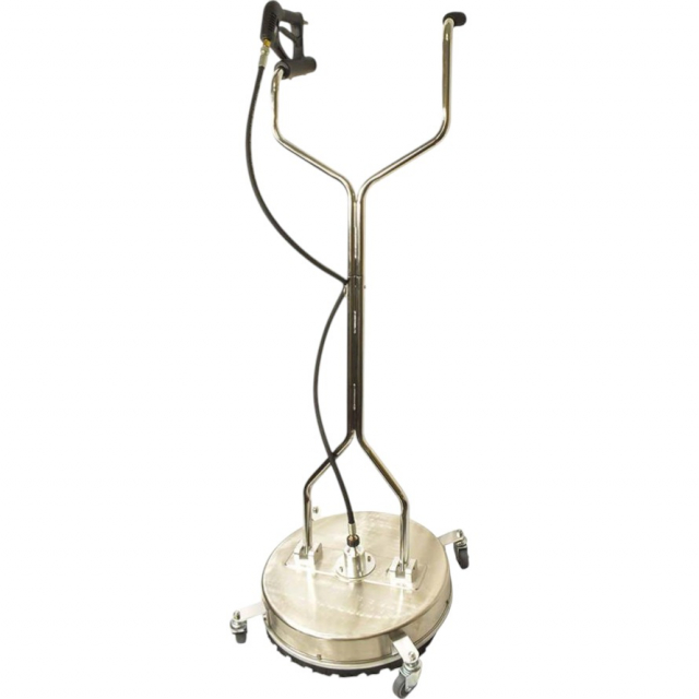 The Interstate Pneumatics PW5305 20" Stainless Steel Dual-Handle Surface Cleaner is the ideal pressure washer attachment for efficiently cleaning large surfaces like driveways, parking lots, sidewalks, shop floors, patios, and decks. Equipped with two high-pressure rotating jets, it delivers a thorough, non-marring clean with 10 times more coverage than a standard nozzle. The 20" diameter ensures quick and efficient cleaning, while the powder-coated steel shroud, stainless steel nozzles, and brass components offer excellent durability and corrosion resistance. Featuring a splash-free side skirt to reduce over-spray and four 360-degree rotating casters for smooth maneuverability, this surface cleaner provides fast, streak-free results. Suitable for both cold and hot water pressure washers, it handles up to 4500 PSI for versatile cleaning tasks.