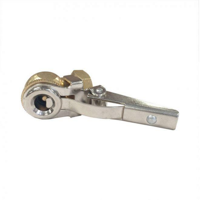 1/4" FPT Brass Angle Ball Foot Chuck with Clip & Shut-off Valve, T03. It is a solid brass chuck, precision machined for leak-free performance and features a straight design for easier connection. There is a quick-release lever that easily attaches and removes from tire valve stem allowing for hands-free operation. This product is a great effort-saver for large inflation jobs.