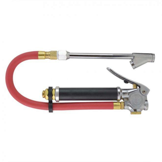 This tire inflator features pressure range of 10-120 PSI in 2 PSI increments and has chrome plated metal casting, precision machined brass internal parts, and Buna-N (Nitrile) O-rings. It is a heavy duty inflator for large trucks. This kit includes a Red Rubber Hose Whipend, 12" long with 6" Dual Foot Truck Chuck (T37). Tire inflator hose assembly with ultra-flexible oil and ozone resistant rubber hose, brass fitting and chuck.