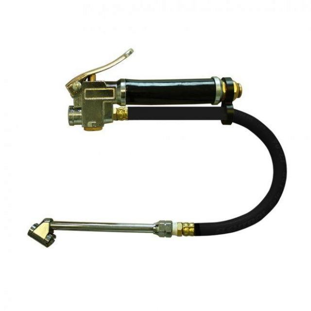 This tire inflator features pressure range of 10-120 PSI in 2 PSI increments and has chrome plated metal casting, precision machined brass internal parts, and Buna-N (Nitrile) O-rings. It is a heavy duty inflator for large trucks. This kit includes a Black Steel Braided Hose Whipend, 12" long with 6" Dual Foot Truck Chuck (T37). Tire inflator hose assembly with ultra-flexible oil and ozone resistant rubber hose, brass fitting and chuck.