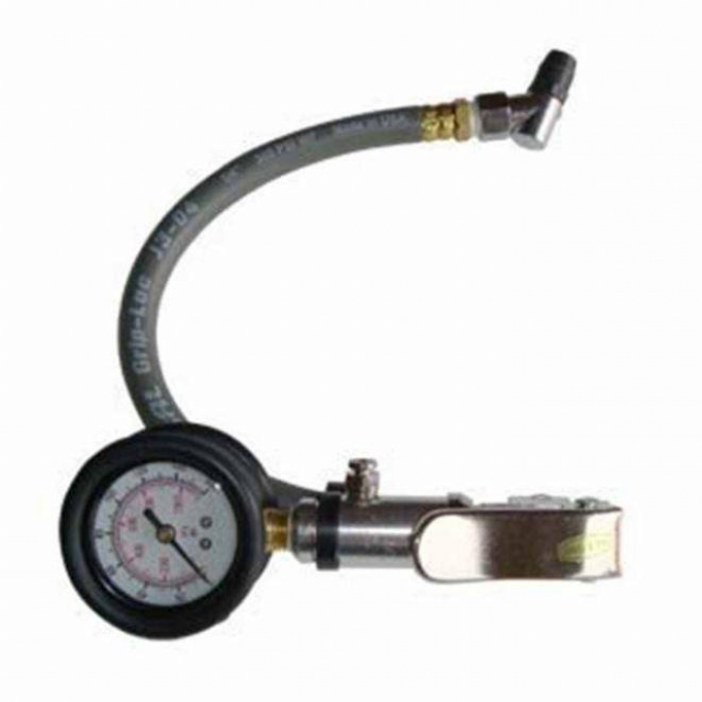 This tire inflator features pressure range of 5-160 PSI in 5 PSI increments and has chrome plated metal casting, precision machined brass internal parts, and Buna-N (Nitrile) O-rings. It is a heavy duty inflator for easy use with sport (alloy) wheels, motorcycles, cars and trucks. This kit includes a Red Rubber Hose Whipend, 12" long with Angle-In Tapered Chuck (T05). Tire inflator hose assembly with ultra-flexible oil and ozone resistant rubber hose, brass fitting and chuck.