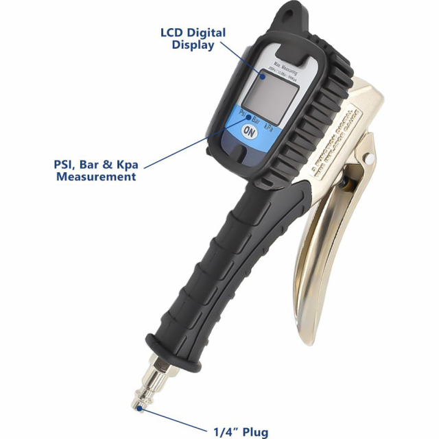 The Interstate Pneumatics TF8000 Digital Tire Inflator Gauge is a high-performance inflator designed to measure the air pressure of various tire sizes and vehicle types. Manufactured from a heavy-duty die-cast body with a rubber shroud for durability, performance, and comfort. Equipped with a large digital LCD screen that displays three units of measurement: PSI (0-200), kPa (0-1379), and Bar (0-14). This digital tire inflator gauge can be combined with various hose inflator whips, hoses, and pressure fittings to adapt to pressure inflating and gauging equipment.