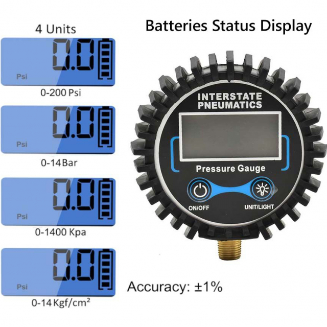 Interstate Pneumatics TG2012-D Round Digital Tire Pressure Gauge 2 Inch Dial Size with 1/8 Inch NPT Bottom Connector and Rubber Protector - Display Pack.