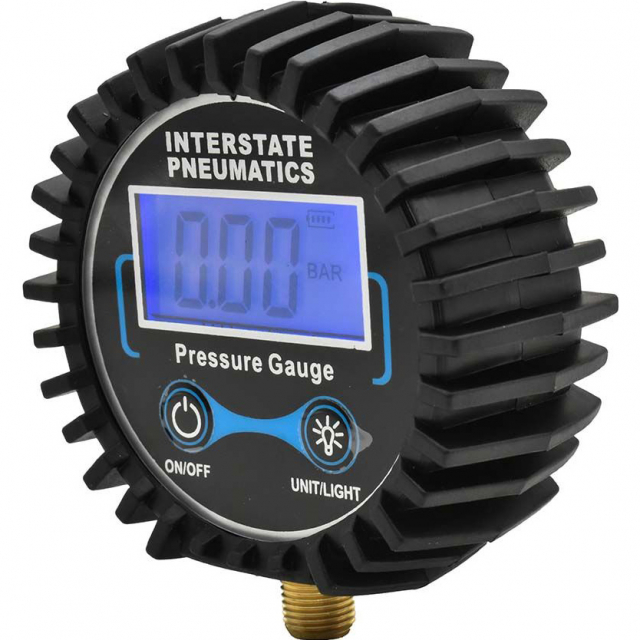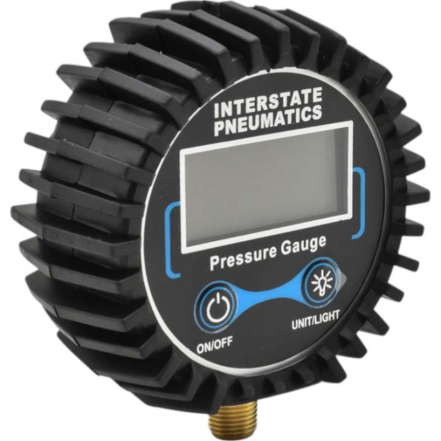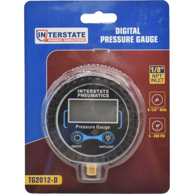 Interstate Pneumatics, TG2012-D, Round Digital Tire Pressure Gauge 2" Dial Size with 1/8" NPT Bottom Connector and Rubber Protector in Display Pack
