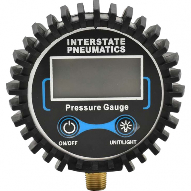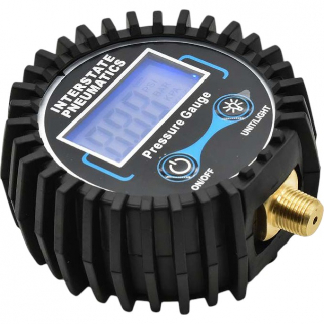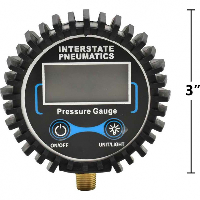 Interstate Pneumatics, TG2012-D, Round Digital Tire Pressure Gauge 2" Dial Size with 1/8" NPT Bottom Connector and Rubber Protector in Display Pack