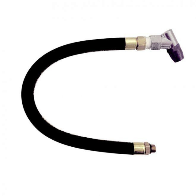 12" long, 1/4" Black Steel Braided Rubber Hose comes with an angle in tapered chuck with internal shut off valve. Designed to fit both valves on dual wheels. Replacement tire inflator hose assembly with flexible oil and ozone resistant rubber hose, brass fitting, and chuck.