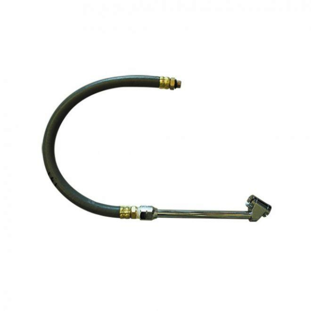 12" long, 1/4" Red Rubber Hose comes with a 11" long dual foot chuck with no internal shut off valve for use on inflator gauges only. This replacement tire inflator hose assembly features flexible oil and ozone resistant rubber hose, brass fitting, and chuck.