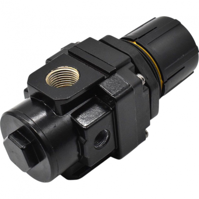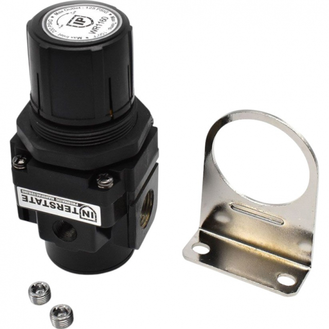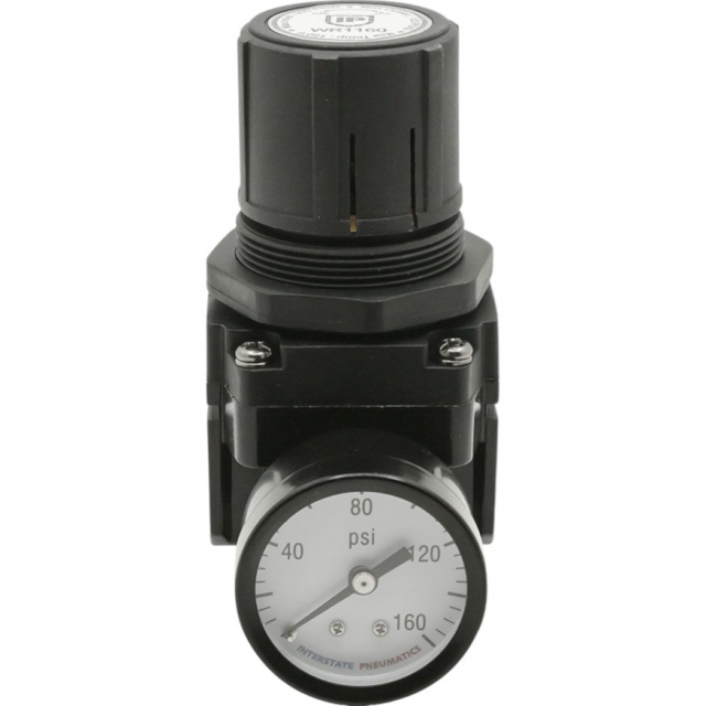 Interstate Pneumatics 3/8" Standard Regulator Inlet 200 PSI- Outlet 125 PSI with Gauge. Pneumatic equipment that operates at higher than recommended pressure can cause excess torque, force and wear and can waste compressed air. This unit regulates air pressure of the air-line to prevent damage. Provides fine air control for spray guns and air tools. It adopts balanced inlet with relief device. It has the advantage of stable pressure, high precision, quick reaction & firm lockup. It can be freely combined with other air source treatment products.