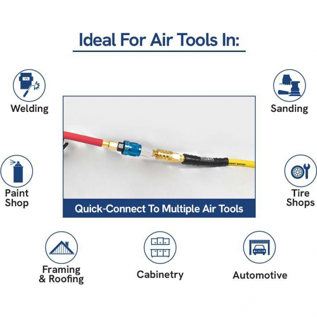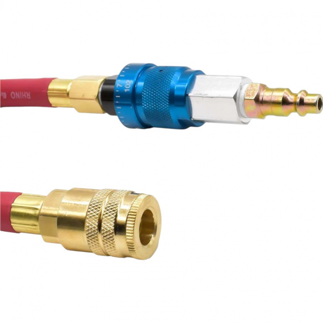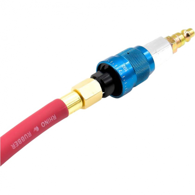 The Interstate Pneumatics WR1000A-QC 1/4" Industrial Quick Connect 72-115 Adjustable PSI Regulator Whip offers a quick and efficient solution for regulating pressure in an airline while using multiple air tools. Attach the whip to your airline for easy pressure regulation, eliminating the need for multiple regulators on individual tools. Equipped with a 1/4" industrial (I/M style) brass coupler and an adjustable 72-115 PSI pressure regulator. Two brass ferrules crimped onto the 12" Rhino Rubber Hose Whip ensure a leak-free and durable connection. Quickly switch between air tools without adjusting or swapping regulators, boosting workflow efficiency.