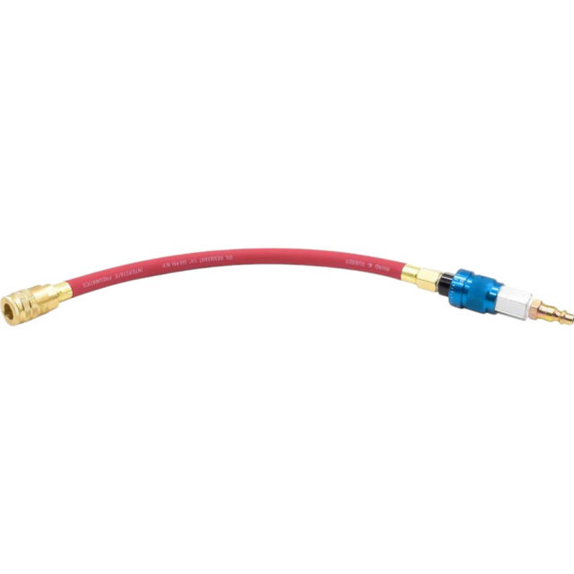 The Interstate Pneumatics WR1000A-QC 1/4" Industrial Quick Connect 72-115 Adjustable PSI Regulator Whip offers a quick and efficient solution for regulating pressure in an airline while using multiple air tools. Attach the whip to your airline for easy pressure regulation, eliminating the need for multiple regulators on individual tools. Equipped with a 1/4" industrial (I/M style) brass coupler and an adjustable 72-115 PSI pressure regulator. Two brass ferrules crimped onto the 12" Rhino Rubber Hose Whip ensure a leak-free and durable connection. Quickly switch between air tools without adjusting or swapping regulators, boosting workflow efficiency.