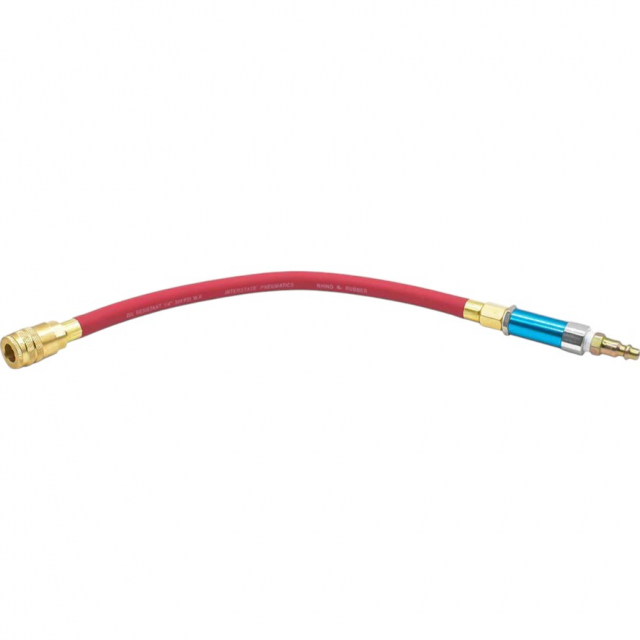 The Interstate Pneumatics WR1110-QC 1/4' Industrial Quick Connect 90 PSI Regulator Whip offers a quick and efficient solution for regulating pressure in an airline while using multiple air tools. Attach the whip to your airline for easy pressure regulation, eliminating the need for multiple regulators on individual tools. Equipped with a 1/4" industrial (I/M style) brass coupler and a 90 fixed preset pressure PSI regulator. Two brass ferrules crimped on to the 12" Rhino Rubber Hose Whip ensure a leak-free and durable connection. Quickly switch between air tools without adjusting or swapping regulators, boosting workflow efficiency.