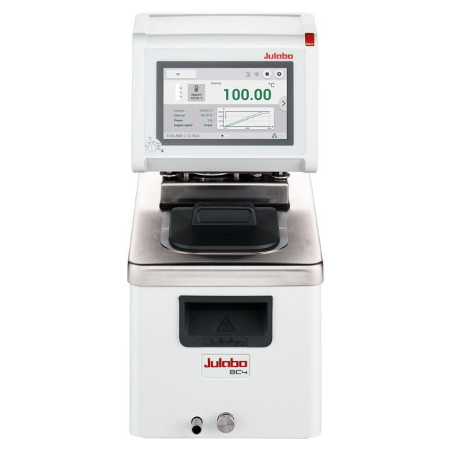 MAGIO MS-BC4 heating circulator with 4L bath tank and lid with 1 or 2 kW heating power to +300 °C. Large, color touchscreen UI with built-in help functions. For internal and external temperature applications. Includes Intelligent Cascade Control, self optimizing for optimum results with settings for band limit, limit setting, co-speed factor and control dynamics. An variable speed pressure / suction pump provides strong circulation for internal or external applications. A built-in cooling coil enables counter cooling with tap water. Barbed fittings for 8 and 12 mm ID tubing are included (pump connections M16x1 male). Includes Pt100 connection for external monitoring and control, electronically adjustable pressure/suction pump, RS232/RS285, USB and Ethernet ports with optional slot for analog communication (requires module 9900100). Modbus TCP/IP incorporated. Stakei port for external accessory control (solenoid valve, etc.). Class III (FL) according to DIN 12876-1.