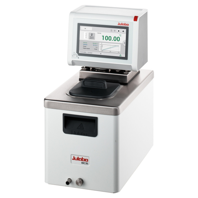 MAGIO MX-BC6 heating circulator with 6L bath tank and lid with 3 kW heating power to +300 °C. Large, color touchscreen UI with built-in help functions. For internal and external temperature applications. Includes Intelligent Cascade Control, self optimizing for optimum results with settings for band limit, limit setting, co-speed factor and control dynamics.