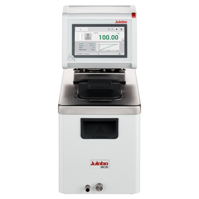 MAGIO MX-BC6 heating circulator with 6L bath tank and lid with 3 kW heating power to +300 °C. Large, color touchscreen UI with built-in help functions. For internal and external temperature applications. Includes Intelligent Cascade Control, self optimizing for optimum results with settings for band limit, limit setting, co-speed factor and control dynamics.
