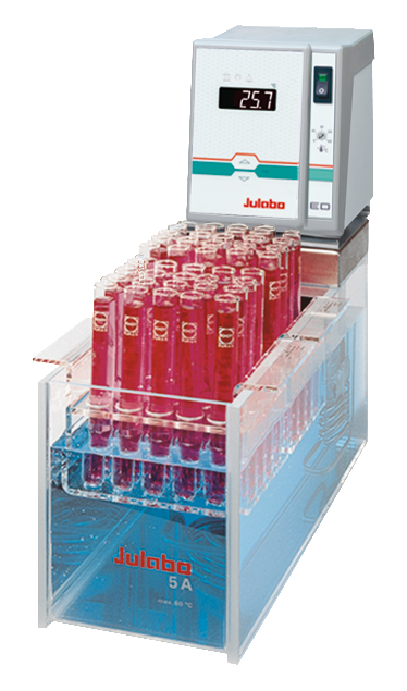 JULABO bath circulators for highly precise temperature control of objects in the circulator bath. The circulator is mounted onto a bridge and can be easily detached. A variety of bath inserts for laboratory glassware, bath covers, and stainless steel adjustable floors are available as accessories.
