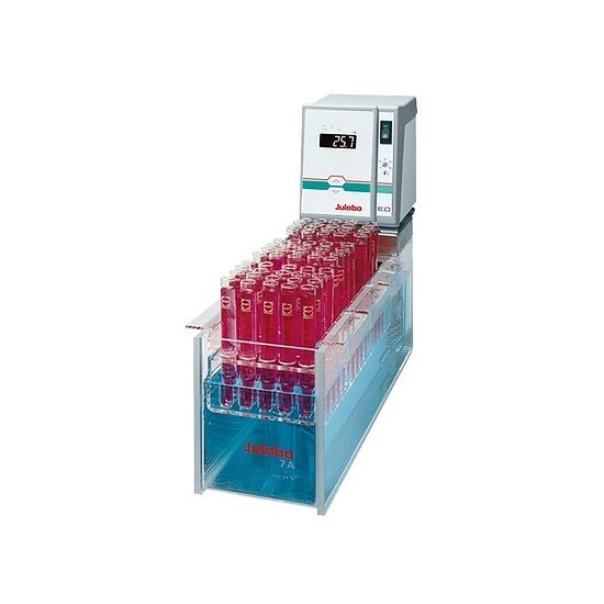 JULABO bath circulators for highly precise temperature control of objects in the circulator bath. The circulator is mounted onto a bridge and can be easily detached. A variety of bath inserts for laboratory glassware, bath covers, and stainless steel adjustable floors are available as accessories.