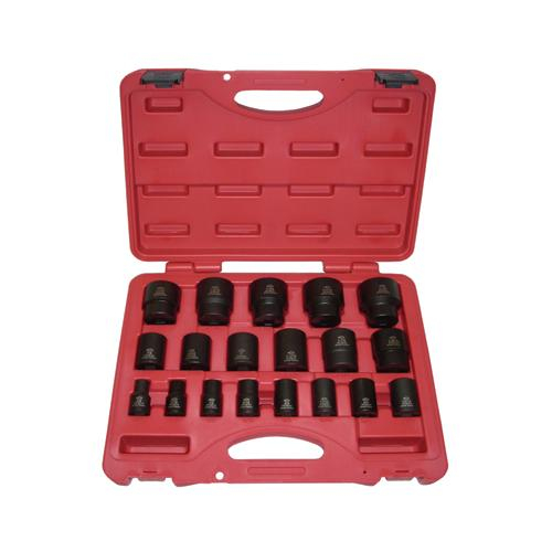 19 piece fractional impact socket set is manufactured from heat-treated chrome-moly steel for wear in professional, rugged environments. Set includes short sockets sized from 3/8" to 1-1/2".