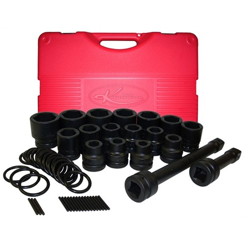 KTI's 18-piece 1" drive impact socket set includes fractional sockets sized 3/4" to 2"; 7" and 13" extensions and replacement o-rings and pins. This set is capable of handling larger applications, such as removal of truck wheels and lug nuts. KTI sockets are designed to perform consistently and withstand even the most heavy-duty applications. Manufactured from heat-treated chrome-moly steel for wear in professional, rugged environments. All sockets are laser engraved for quick identification.