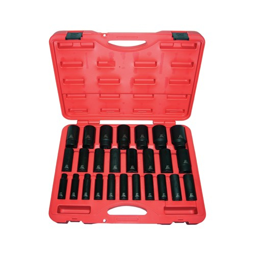 26 piece metric impact socket set is manufactured from heat-treated chrome-moly steel for wear in professional, rugged environments. Set includes deep sockets sized from 10mm to 36mm.
