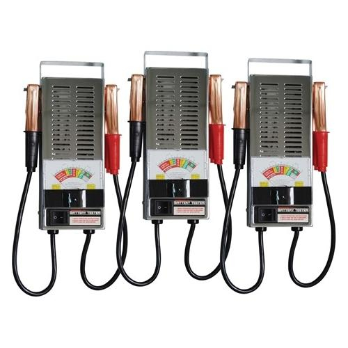 Three pack of extremely handy and portable way to load test suspected low charging batteries. Internal 100 amp loading capacity. Tool checks battery voltage, starter current draw, charging voltage and battery condition. Features extra heavy nickel-plated ventilated case, heavy duty cable, copper-plated clamps, and load safety switch to prevent arcing