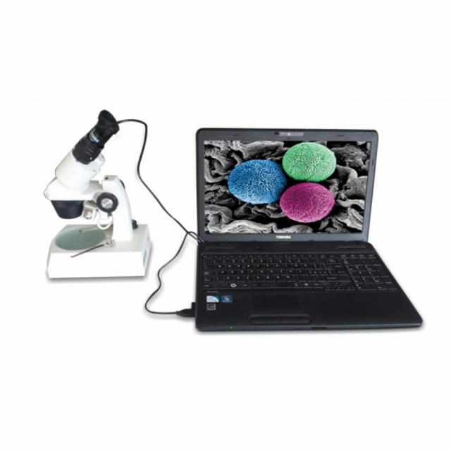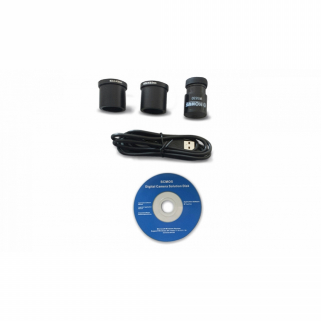 This video set enables the connection between a microscope (either biological or stereoscopic) and a Computer, since it fits in the eyepiece holder (an adapter may be needed as shown below). Then the UB cable and software will let you acquire and store images while using the magnification power of the microscope.