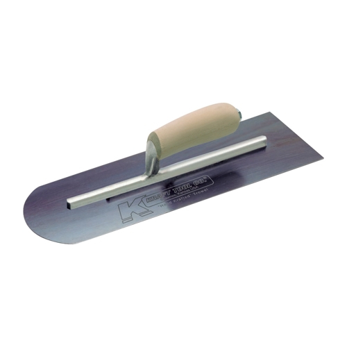 Professional quality blue steel concrete trowel is precision balanced and ready to use. High-quality blue spring steel has the perfect amount of "give" which allows for a more flexible blade when finishing. Each blade is cross-ground to just the right dimension for that perfect feel. The rounded front of the blade prevents gouging of the surface, while the square back allows for finishing flush to the edges and corners. A high-strength, lightweight cast aluminum mounting stands up to the rigors of cement work. Compression-fit stainless steel rivets attach the mounting to the 20" x 5" blade. An oversized toe rivet provides extra strength when applying pressure during finish work. The no-Turn handle design locks the handle to mounting. Kraft Tool's signature flat trowel with a smooth wood handle provides a comfortable grip. The contoured shape of the handle reduces fatigue.