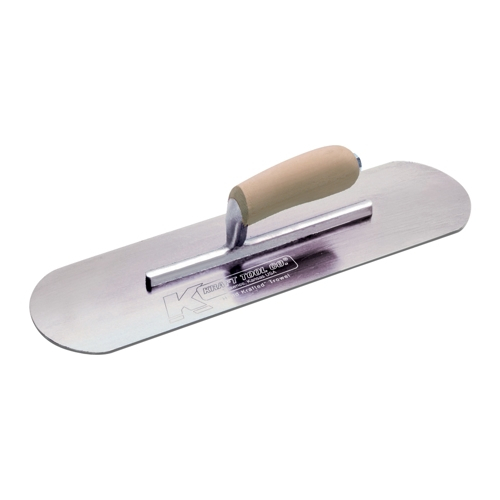 Professional quality carbon steel finishing trowel is precision balanced and ready-to-use. Each blade is cross ground to just the right dimension for that perfect feel. Rounded edges prevent surface gouging while finishing the cement. A high-strength, lightweight cast aluminum mounting stands up to the rigors of concrete work. The short 7-7/8" shank provides additional flexibility to the blade. Compression fit stainless steel rivets attach the mounting to the 18" x 4" blade. Guaranteed No-Turn handle design locks the handle to mounting. Kraft Tool's signature flat trowel with smooth wood handle provides a comfortable grip. The contoured shape of the handle reduces fatigue. Proudly made in the USA.