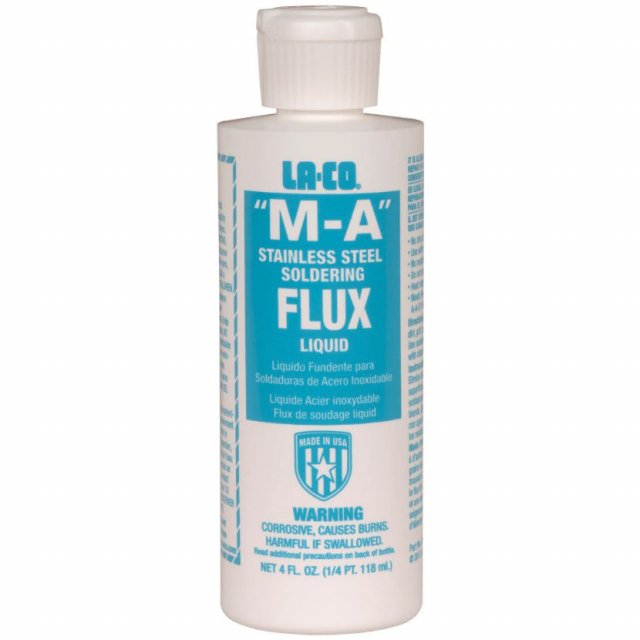 Developed for fast fluxing action on stainless steel, M-A Flux is excellent for projects on stainless gutters and roofs, among many other applications. It contains no zinc chloride and it will not cause progressive corrosion on stainless pipe. There is no neutralizing necessary when using it to solder stainless steel.