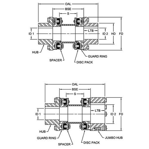 Oversized, or Jumbo, hubs are available for use with the DI Type coupling to allow for larger bore sizes on most DI coupling sizes. This allows for the use of smaller DI couplings in applications where a smaller size coupling can still accommodate the application torque.