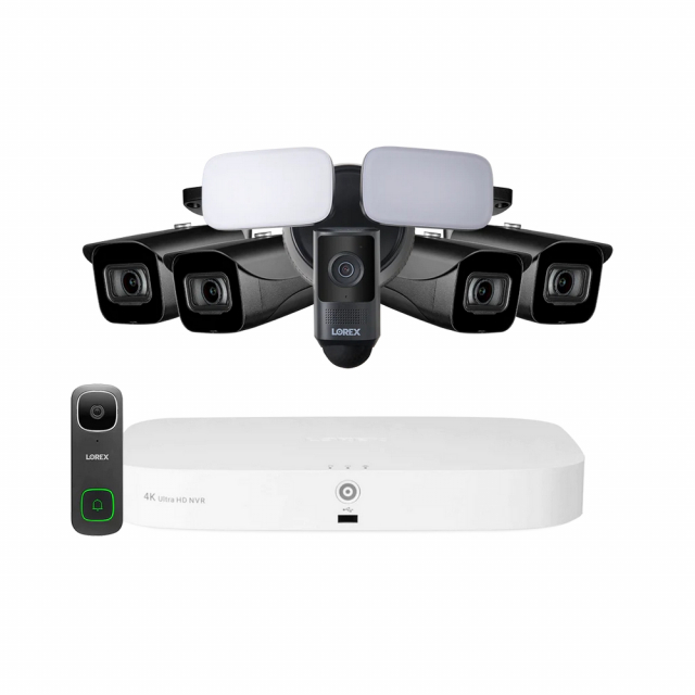 Lorex, FN4K2-84BB-BDF, Fusion 4K 2TB NVR System with 4 x IP Black Bullet Cameras, 2K Wired Video Doorbell and 2K Floodlight