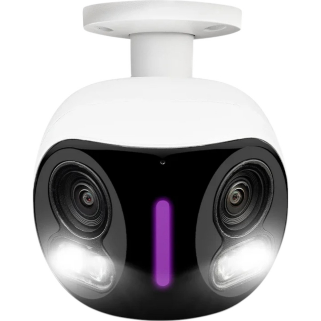 Two Cameras, one big picture - the Lorex 4K Dual Lens Wi-Fi Security Camera. Get a complete 180° panoramic view, thanks to the built-in dual lenses. With 4K clarity, Color Night Vision, Smart Security Lighting and more, this camera provides complete coverage, day and night.