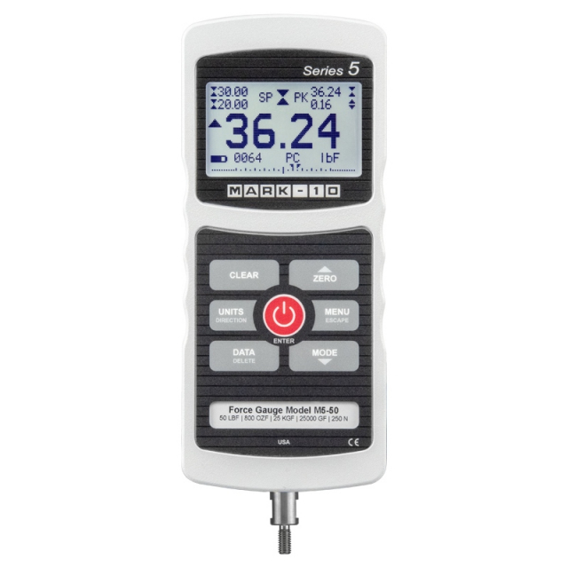 Series 5 advanced digital force gauges are designed for tension and compression force testing in numerous applications across virtually every industry, with capacities from 0.12 lb to 2,000 lbF (0.5 N to 10 kN). The gauges feature an industry-leading sampling rate of 7,000 Hz, producing accurate results even for quick-action tests. Accuracy is ±0.1% of full scale, and resolution is 1/5000. A large, backlit graphics LCD displays large, legible characters, while the simple menu navigation allows for quick access to the gauges’ many features and configurable parameters. Data can be transferred to a PC or other data collector via USB, RS-232, Mitutoyo (Digimatic), or analog outputs. On-board data memory for up to 1,000 readings is included, as are statistical calculations and output to a PC. Integrated set points with indicators are ideal for pass-fail testing and for triggering external devices such as an alarm, relay, or test stand. The gauges are overload protected to 200% of capacity, and an analog load bar is shown on the display for graphical representation of applied force. The Series 5’s averaging mode addresses the need to record the average force over time, useful in applications such as peel testing, while external trigger mode makes switch activation testing simple and accurate. An ergonomic, reversible aluminum design allows for hand held use or test stand mounting for more sophisticated testing requirements. Series 5 force gauges are directly compatible with Mark-10 test stands, grips, and software.