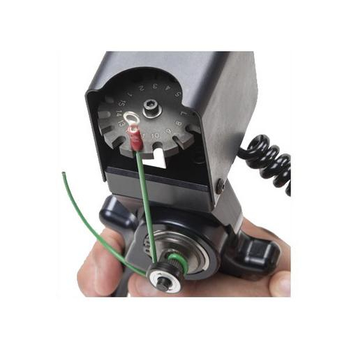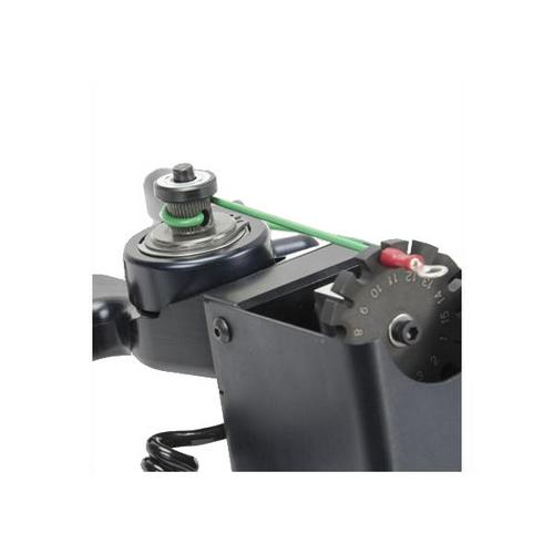 The MR06-200 wire crimp pull sensor is a hand-operated solution for measuring wire crimp pull-off forces. The ergonomic handles and convenient tensioning mechanism make field measurements a breeze for applications up to 200 lbF (1,000 N). Squeeze the handles together to increase tension on the sample until a break occurs. The peak force is recorded by the indicator. A rotating turret with slots of multiple sizes accommodates a wide range of wire diameters, up to 0.25 in. (6.4 mm).