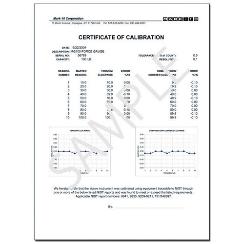 Included with new Series 7, 5 and 4 gauges, and Plug & Test™ sensors, and available with some other instruments for an additional charge of $50. Also supplied with any instruments re-calibrated by Mark-10. As found / as left data can be supplied upon request.