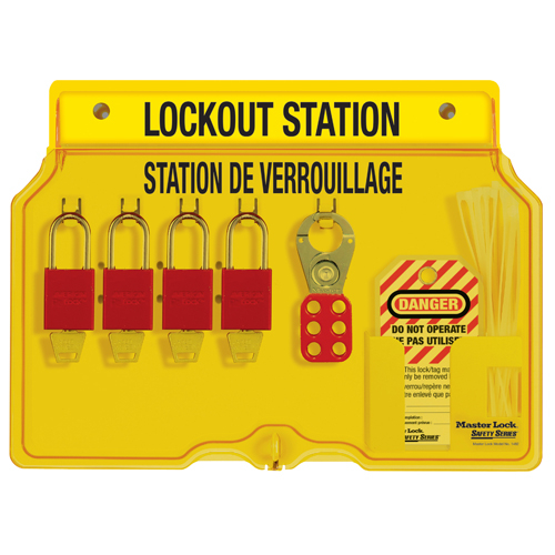 The Master Lock No. 1482BP1106FRC French/English Safety Lockout Covered Padlock Station includes four American Lock No. A1106RED anodized aluminum keyed different padlocks. Padlock station features integrated, one-piece molded construction to eliminate loose parts and resilient polycarbonate material to provide twice the heat resistance and quadruple the impact strength of typical stations. The exclusive translucent cover protects contents and is lockable to prevent loss of valuable products. Safety hasps and tags included.