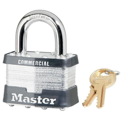 The Master Lock No. 25 Laminated Steel Padlock features a 2in (51mm) wide reinforced laminated steel lock body providing extra strength and a 1in (25mm) tall, 3/8in (19mm) diameter hardened steel shackle for excellent cut resistance.